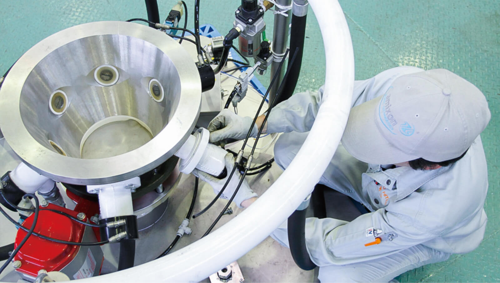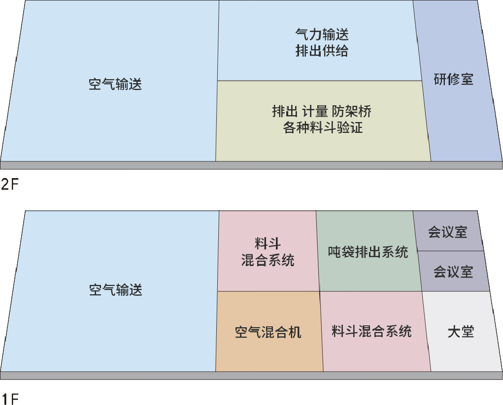 在第2棟,進行各種粉體輸送測試以及相關裝置的測試。配備了料倉、排出短管、破橋設備等裝置。
